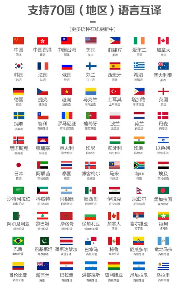 70國語言:中文(簡體)、粵語、中文(繁體)、英語(美國)、英語(菲律賓)、英語(愛爾蘭)、英語(英國)、英語(加拿大)、英語(澳大利亞)、日語、韓語、法語(法國)、俄語、芬蘭語、西班牙語(國際)、希臘語、阿拉伯語(阿聯(lián)酋)、德語(德國)、丹麥語、捷克語、越南語、烏克蘭語、土耳其語、菲律賓語(塔加路)、泰語、瑞典語、塞爾維亞語、羅馬尼亞語、葡萄牙語(葡萄牙)、波蘭語、荷蘭語(荷蘭)、挪威語(博客梅爾)、挪威語(尼諾斯克)、柬埔寨(高棉語)、意大利語(意大利)、印尼語、匈牙利語、印地語、馬來語、以色列(希伯來語)等